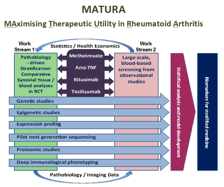 Whilst a number of treatments are available for RA, none of them work for everyone and, currently, doctors have no way of telling which treatment will work best for which people with RA. The aim of MATURA is to find and develop tests that will allow better targeting of the available treatments to those who would benefit most, thereby improving the selection of the best treatment for individual patients.